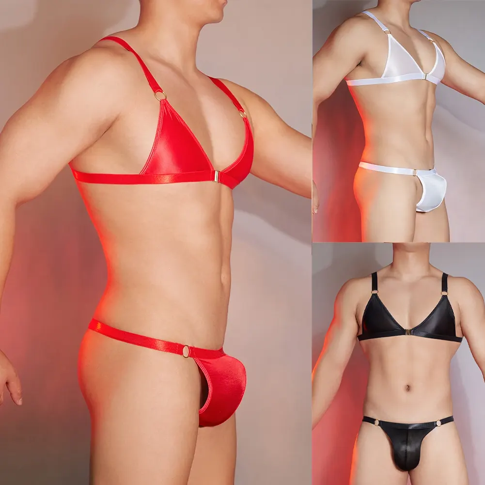 Descubre el atrevido y sensual conjunto de lencería masculina diseñado para hombres que desean resaltar su lado más sexy y sofisticado. Este conjunto incluye un sujetador ajustable y una tanga con parte trasera en forma de T, proporcionando un ajuste cómodo y firme que se adapta perfectamente al cuerpo masculino. El acabado brillante al óleo en color rojo, blanco y negro intenso le da un toque llamativo y audaz, ideal para quienes buscan destacar.